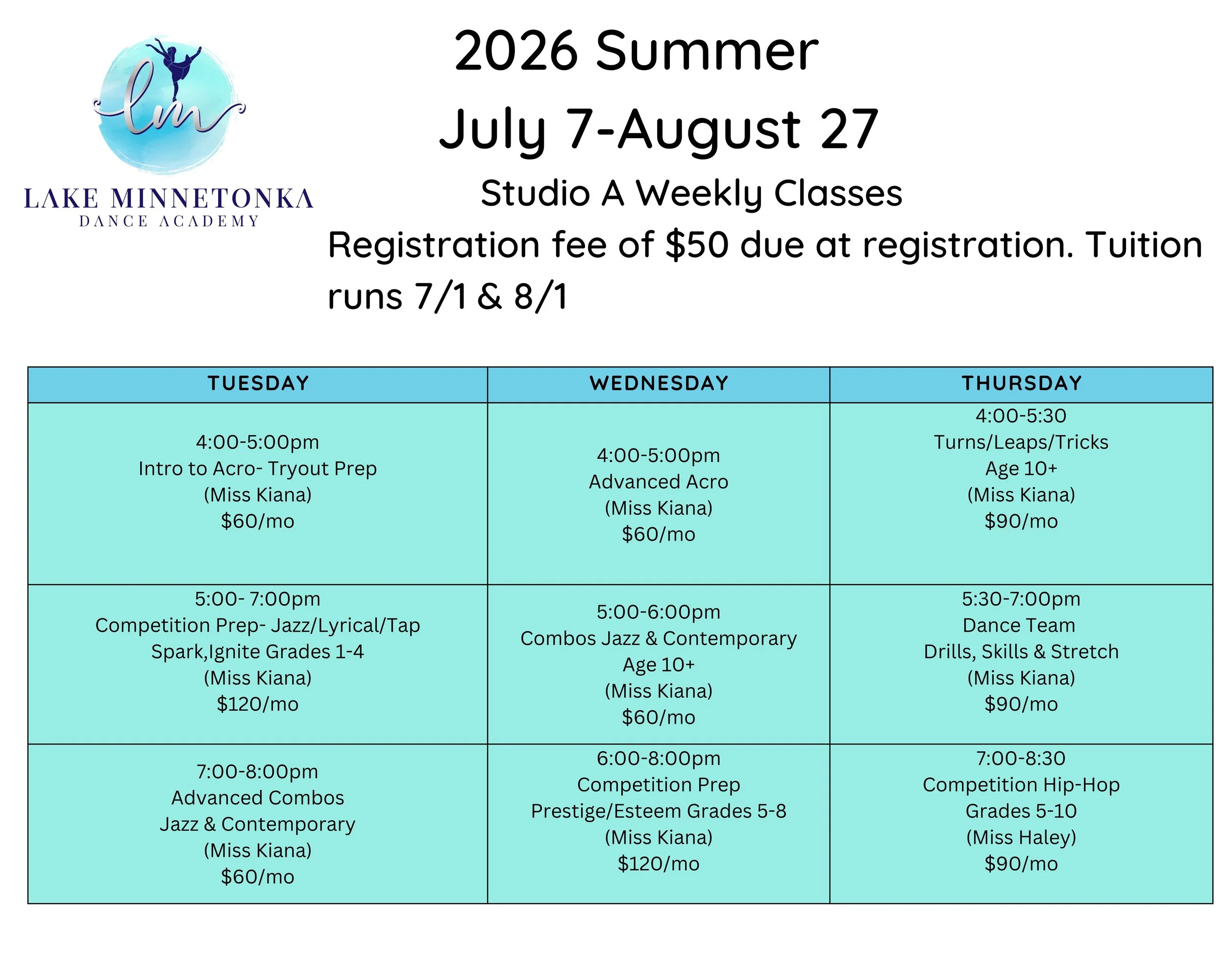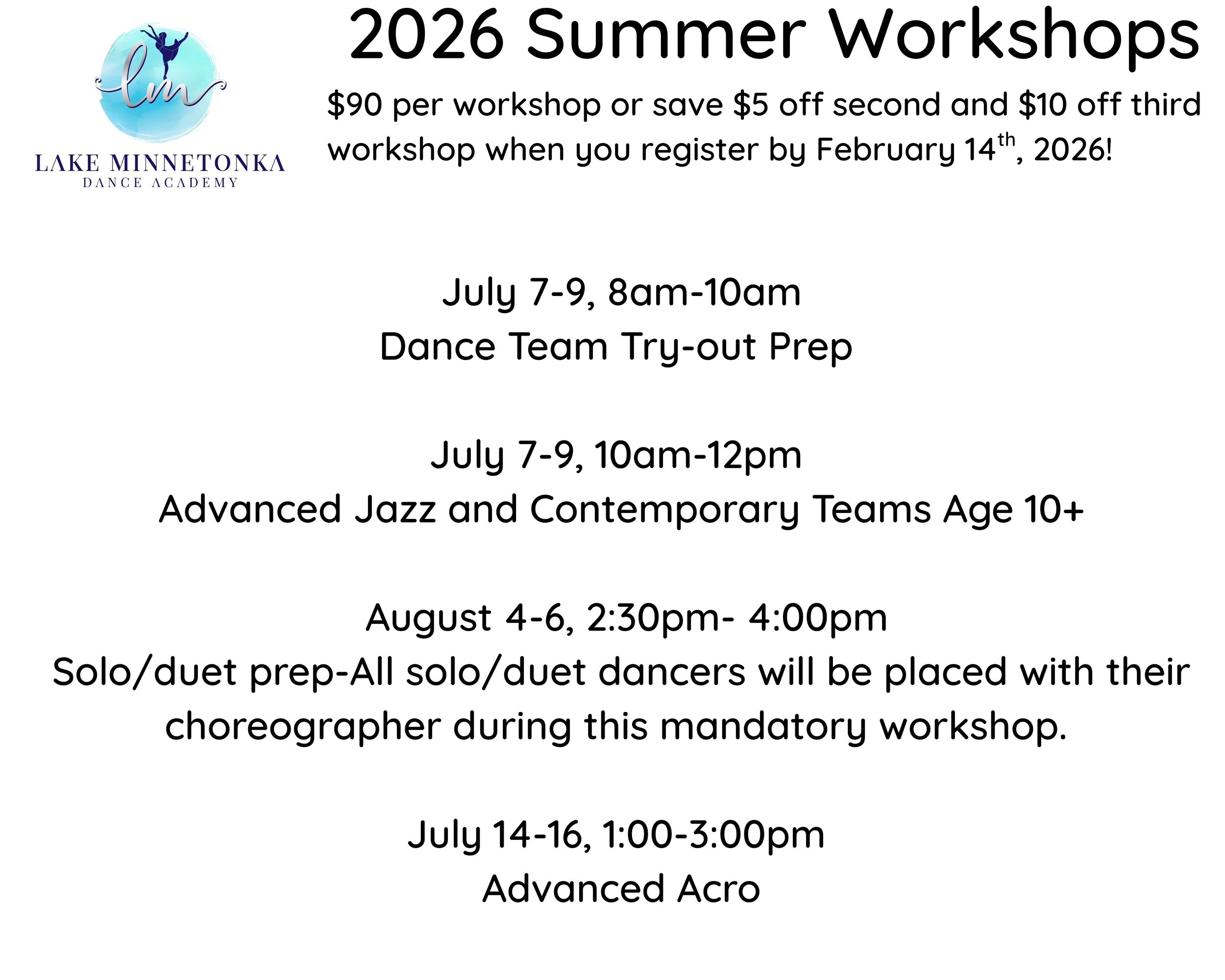 Summer class registration guideline: Please register dancers for their grade as of Sept. 2026. Classes will focus on strengthening skills to make your desired line. (Private lessons may also be needed to hone in on specific skills. Teachers will reach-out as needed. Email questions to Miss Kiana- info@lmdanceacademy.com)