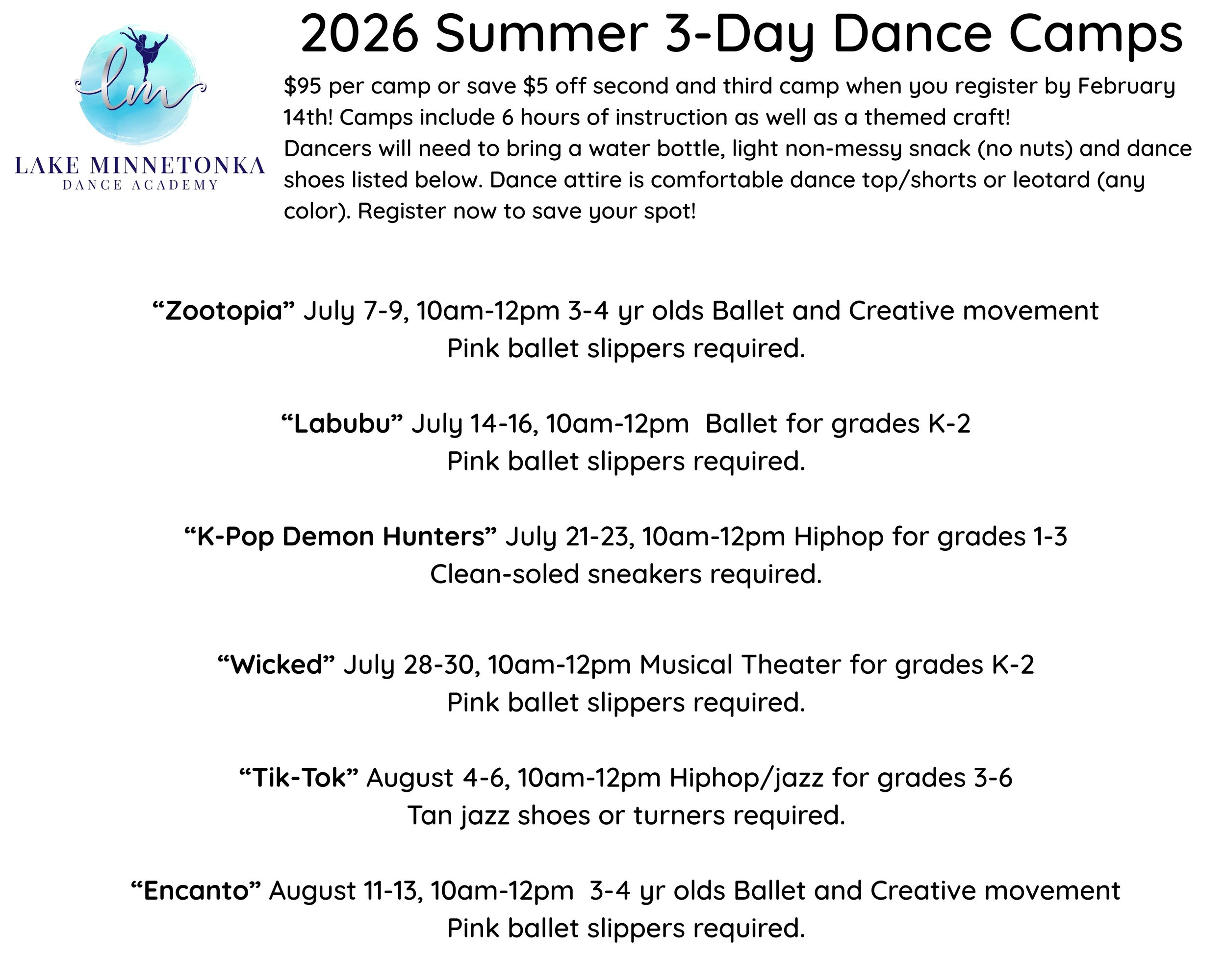 Summer 3-day themed dance camps coming this summer! Encanto, Wicked, K-pop demon hunter, Tik-tok and more! Camps include a themed craft. Register now as space is limited. (Scroll down for schedule)