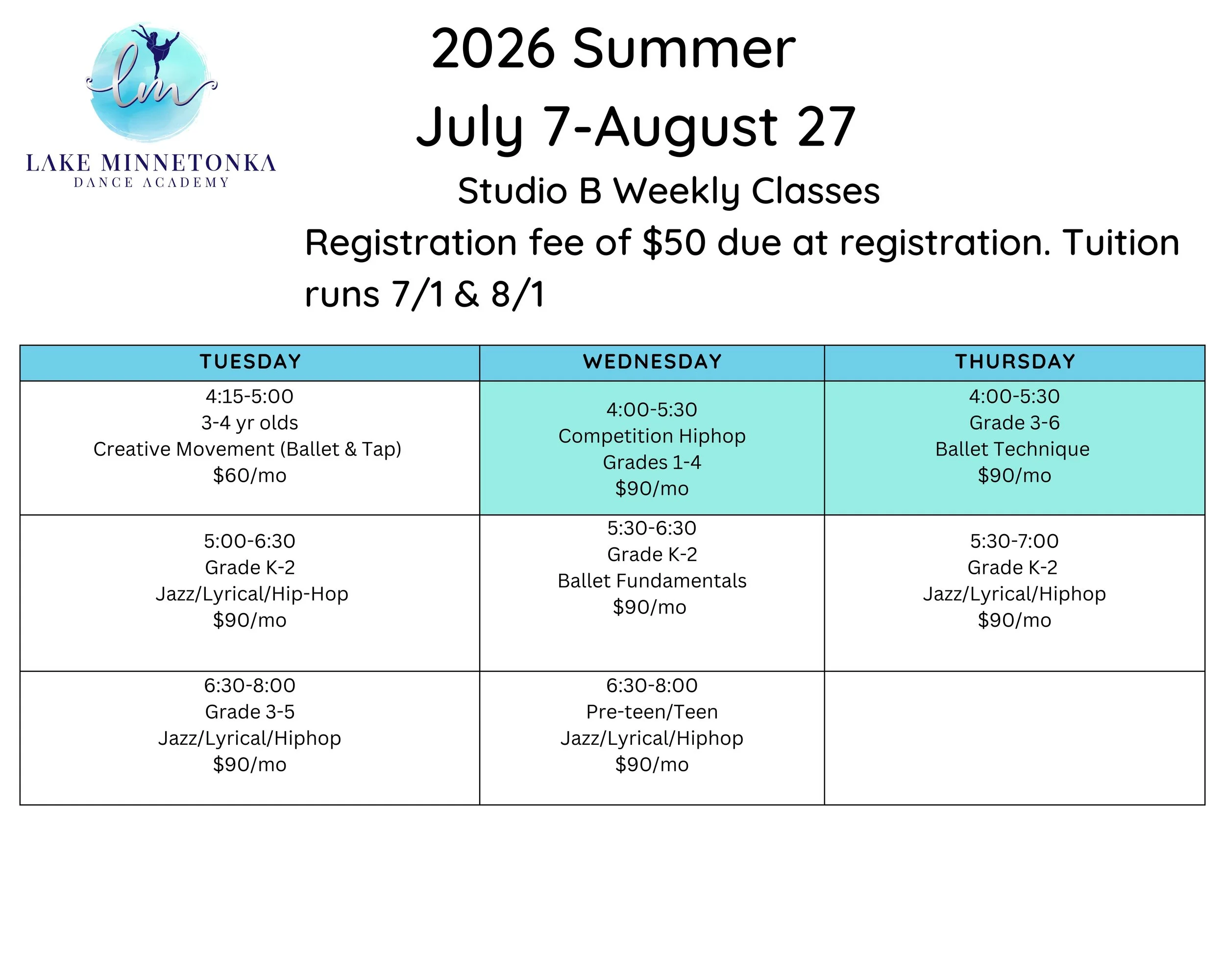 $50 class registration fee (non-refundable) due at time of registration to save your spot. Tuition will process 7/1 & 8/1. Tuition is $60 monthly for 1 hour classes and $90 monthly for 1.5 hour classes. Recreational classes have a multi-class discount of $10 for the second class. (Per dancer) Please see LMDA Handbook for shoe order link and dress-code.
